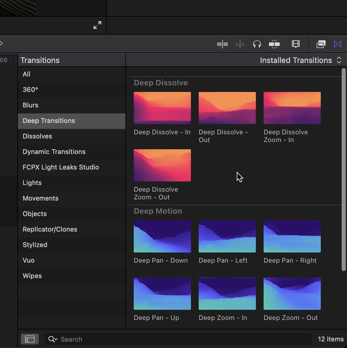 The transitions are built on the depth of your footage, ensuring you get a unique result for each clip you use. The 12 transitions will never look the same; use them as much as you want, it feels like you're using a different transition every time.