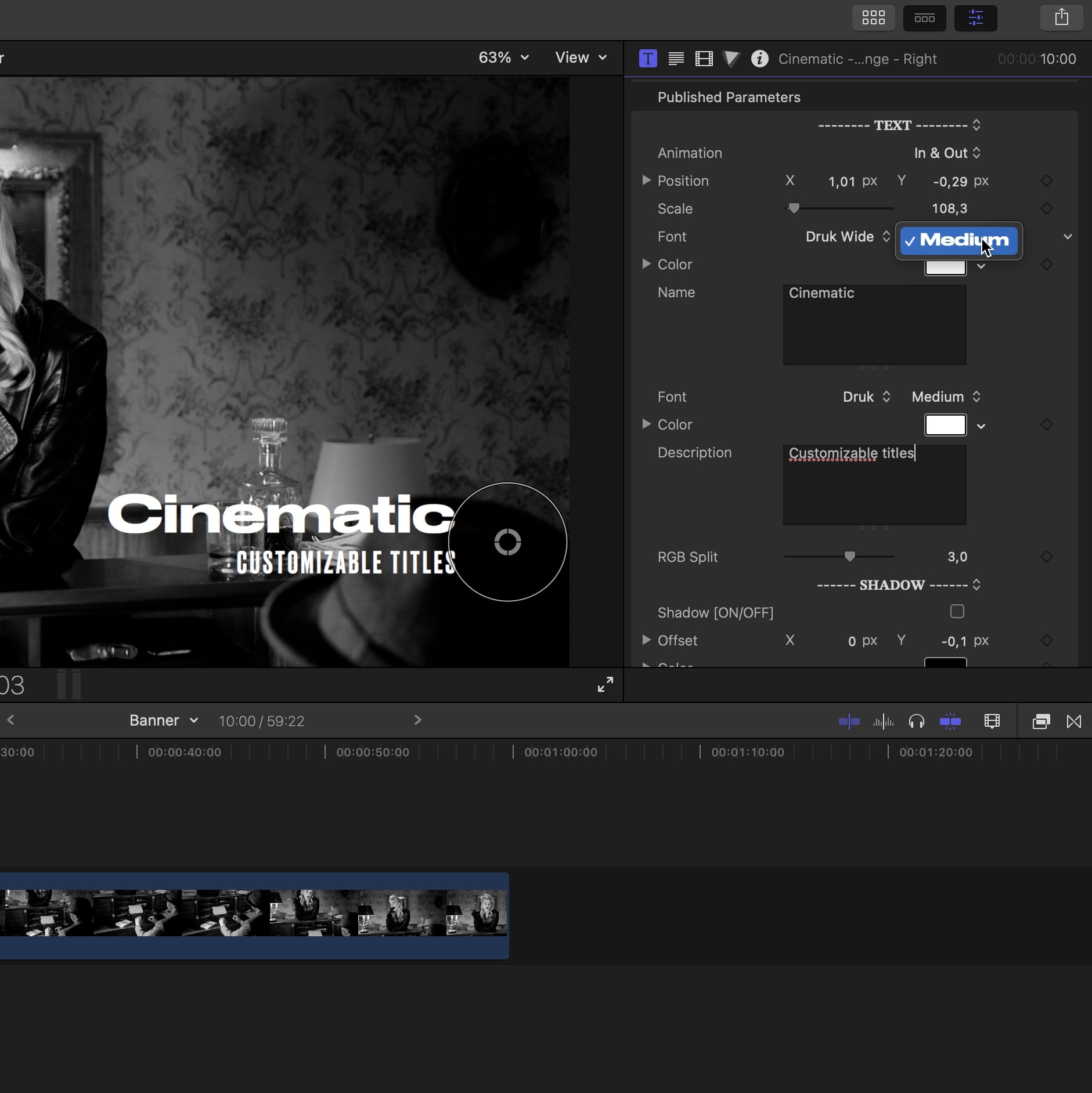 Start from one of the simple and subtile default look and customize the font, color, layout, add a box, borders, shadow, etc... Give your lower third the tone you want to match the style of your edit!